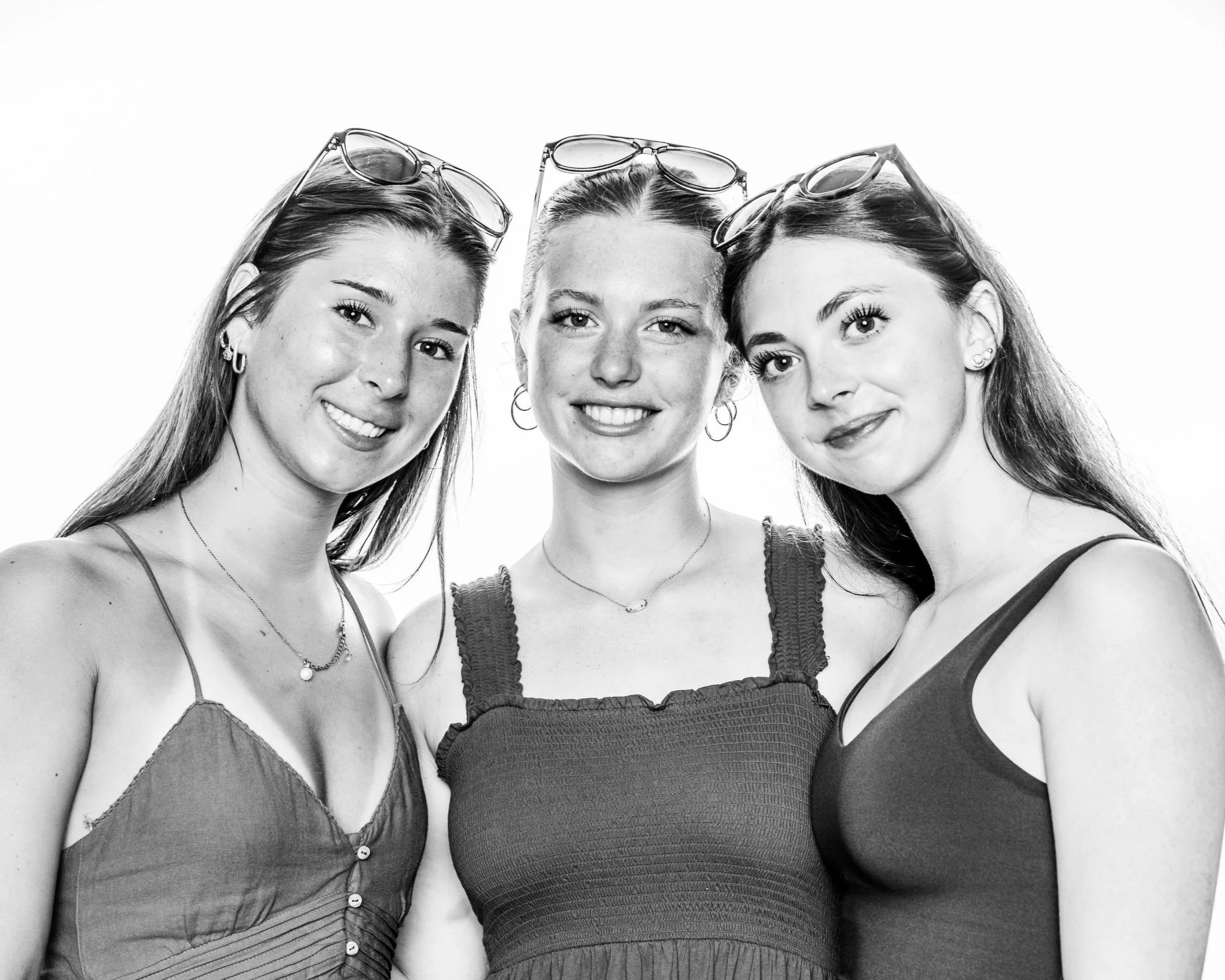 Guests step into a clean white backdrop and professional lighting setup—designed to flatter, styled to impress.